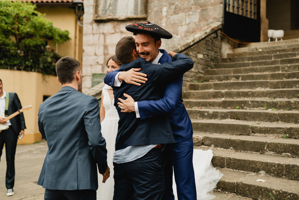 Familiares y amigos dedicaron palabras, creando momentos muy especiales. Tras el intercambio de alianzas, los invitados sorprendieron a la pareja con un aurresku, una tradición que llenó de alegría la salida de los novios.